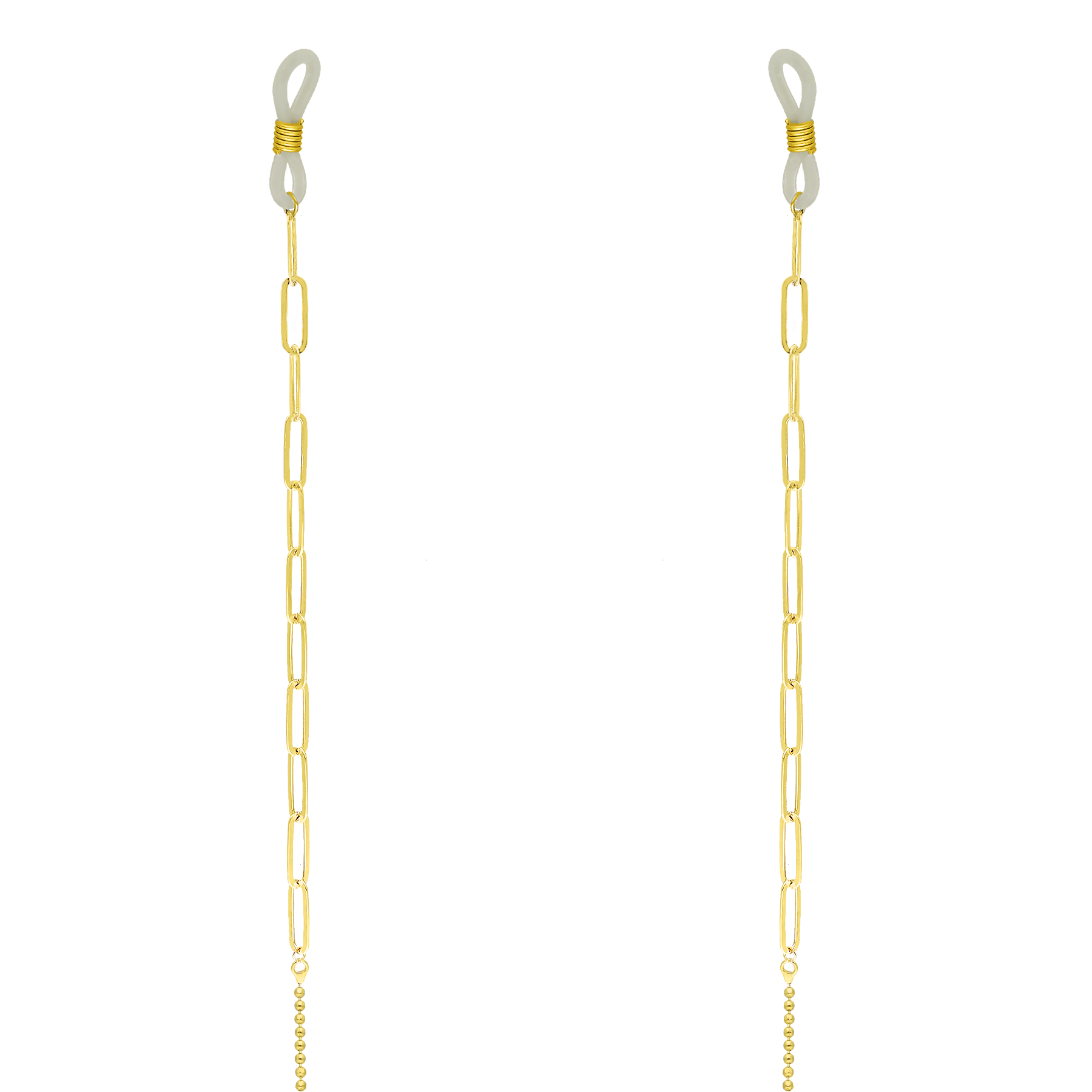 Subtelny srebrny łańcuszek pokryty 24-karatowym złotem wraz z ozdobnymi spinaczami. Idealny do korekcyjnych jak i przeciwsłonecznych okularów. Na końcach przezroczyste uchwyty do założenia na okularach.