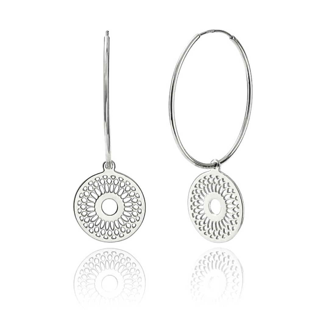 Subtelne srebrne kolczyki z modnymi ażurowymi kołami to propozycja dla miłośniczek współczesnego piękna.