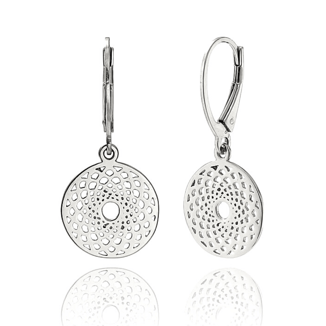 Wyjątkowe srebrne rodowane kolczyki na angielskim zapięciu z dekoracyjnymi ażurowymi kołami to propozycja, obok której nie sposób przejść obojętnie.