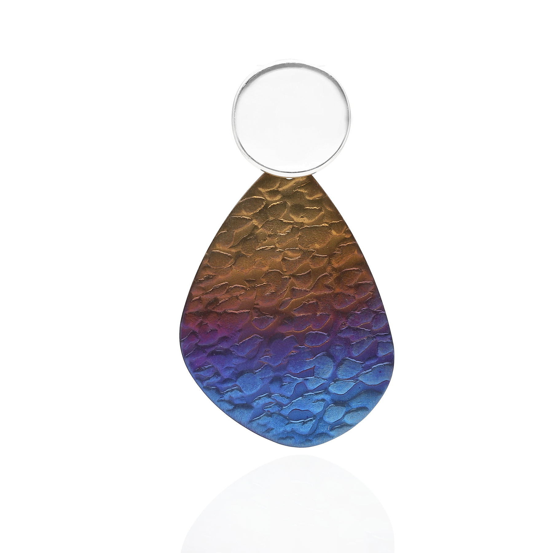 Zaskakujący niebanalną formą, atrakcyjny wisiorek wykonany z rodowanego srebra wraz z oryginalnym fakturowanym, ręcznie wybarwianym Tytanem ze srebrną blaszką to ukłon w stronę miłośniczek współczesnego designu.