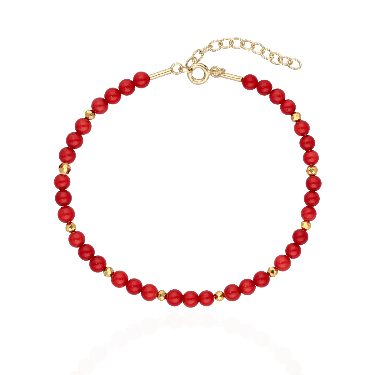 Niezwykle dekoracyjna bransoletka, wykonana z kamieni koralowych oraz srebrnych, pozłacanych 24-karatowym złotem, kulek to wspaniała propozycja dla kobiet ceniących delikatność i wyczucie stylu.