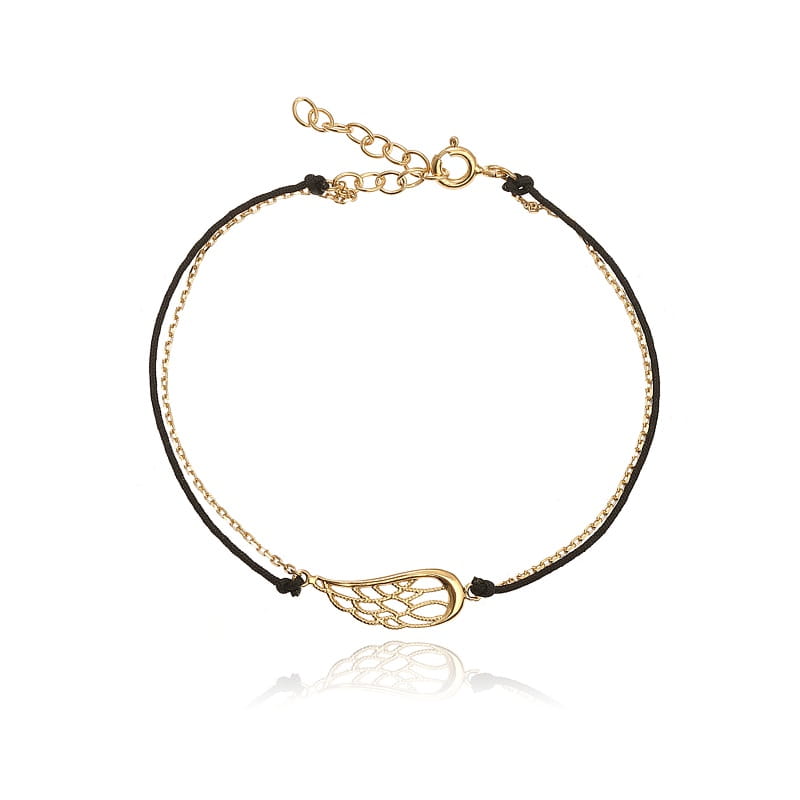 Bransoletka srebrna, pozłacana 24-karatowym złotem ze skrzydełkiem na czarnym sznurku to idealna propozycja dla subtelnych Kobiet.