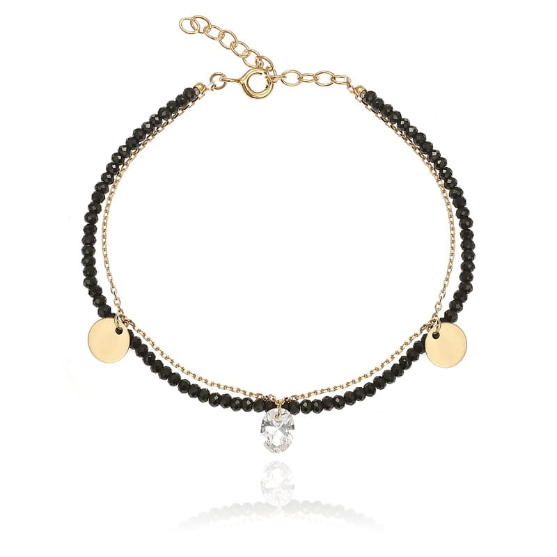 Podwójna bransoletka wykonana z pozłacanego srebra z dodatkiem czarnych spineli to ukłon w stronę pasjonatek współczesnego piękna. Całości dopełniają pozłacane kółeczka wraz z mieniącą się cyrkonią.