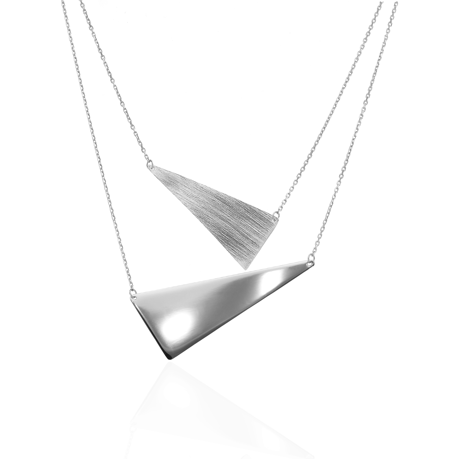 Niezwykle elegancki, srebrny naszyjnik rodowany z dużymi elementami ozdobnymi – jednym satynowanym i jednym polerowanym to wytworna propozycja dla wyróżniających się kobiet.