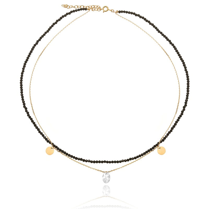 Zjawiskowy, podwójny srebrny naszyjnik pokryty 24-karatowym złotem wraz z czarnymi spinelami oraz pozłacanymi 24-karatowym blaszkami i mieniącą się cyrkonią to nieodzowny element każdej kobiecej szkatułki.