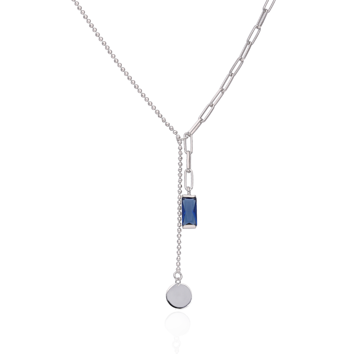 Piękny srebrny, rodowany naszyjnik złożony z dwóch rodzajów łańcuszka – kulkowego i najmodniejszych spinaczy wraz z niebieskim kamieniem i blaszką to obowiązkowa pozycja każdej stylowej szkatułki.